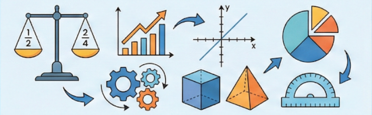 Structured mastery of fractions, ratios, algebraic thinking, geometry, and data handling.