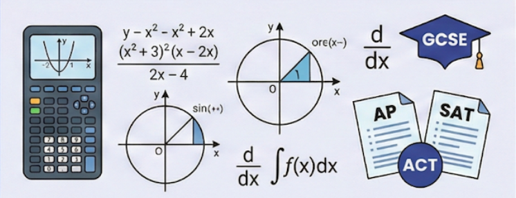 Advanced concepts including Algebra I & II, Geometry, Trigonometry, Precalculus, and Calculus.